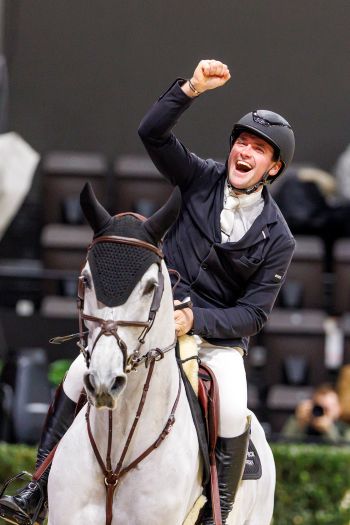 Die Freude eines Siegers – Josch Löhden auf dem zehnjährigen Hannoveraner Schimmelwallach Schabernack nach dem Gewinn des Championts von Basel um die „Goldene Trommel“ – als erster Deutscher auch noch…