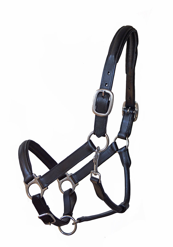 Lederhalfter „Kent“ weich gepolstertes Lederhalfter 2- fach verstellbar Kehlriemen mit Karabinerhaken chromfarbene Beschläge Farbe: schwarz Größe: Cob, Full