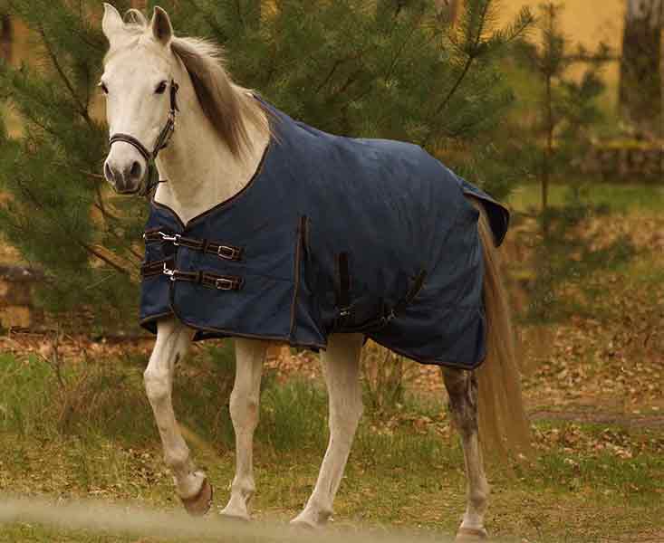 Regendecke mit Fleecefutter Hoch angeschnittener Hals für besten Wind – und Regenschutz, verhindert Druckstellen im Widerristbereich. Das leichte Fleecefutter bietet hohen Tragekomfort und verbessert die Abschwitzeigenschaften der Decke. wind – und wasserdicht 600 Denier Ripstop Fleecefutter im Rückenbereich Taftfutter im Seiten und Brustbereich PU-beschichtet dampfdurchlässig doppelte Frontverschnallung, Dornschnallen ohne Rückennaht variabler Hakenverschluss Kreuzgurte mit Elastikeinsatz hohe Gehfalte Hinterhandbegurtung Beinschnüre verstellbar Schweiflatz waschbar Farbe : navy Größe : 125, 135, 145, 155, 165 cm