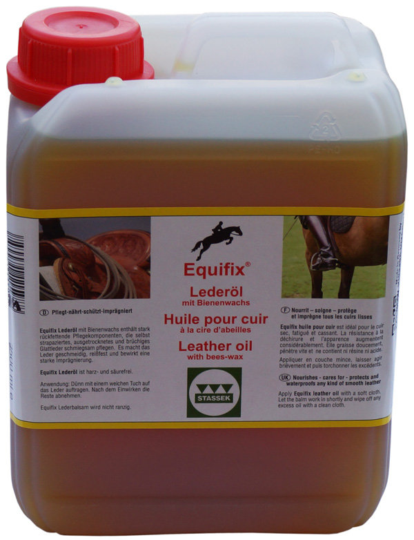 EQUIFIX Lederöl mit Bienenwachs – nährt – pflegt – schützt und imprägniert alle Glattleder – besonders geeignet für sehr strapaziertes oder hartes Leder Verzweifeln Sie nicht an hart gewordenem Leder! EQUIFIX Lederöl mit Bienenwachs ist ein Pflegeöl für höchste Ansprüche. Es enthält eine stark rückfettende Pflegekomponente, welche sich besonders für strapaziertes, ausgetrocknetes und auch sehr hart gewordenes Leder eignet. Die Reißfestigkeit, die Geschmeidigkeit und das Aussehen des Leders verbessern sich deutlich. EQUIFIX Lederöl garantiert beste Pflege und Nähreigenschaften. Es zieht schnell ein und ist harz- und säurefrei. Die sorgfältig ausgesuchten Wirkstoffe entfernen leichte Verschmutzungen auf schonende Weise und sorgen für eine sehr starke Imprägnierung. Das echte Bienenwachs schützt die Oberfläche nachhaltig und wappnet es gegen äußere Einflüsse. Die natürlichen hydrophoben Bestandteile machen das Leder widerstandsfähig und wasserabstoßend.Anwendung: Mit einem weichen Tuch auf das Leder auftragen. Kurz einwirken lassen und dann die restlichen Überschüsse mit einem sauberen Tuch abwischen. Bei stärker verschmutztem Leder empfehlen wir vorher die Reinigung mit EQUIFIX Sattelseife. Tipp : Pflegen Sie Ihr Leder abwechselnd mit EQUIFIX Lederöl und EQUIFIX Lederbalsam. Wenn das Leder sehr hart ist, behandeln Sie es vor der Anwendung mit EQUIFIX Sattelseife. Sie werden begeistert sein, wie geschmeidig das Leder wieder ist.Zur fettfreien Reinigung (z.B. Sitzflächen von Sätteln oder Ledermöbeln) empfehlen wir EQUIFIX Triplex Lederreiniger.Und wenn es einmal ganz schnell gehen muss: EQUIFIX Faulpelz ! Erhältliche Größen: 500 ml – 2,5 lit. – 5 lit. – 10 lit.