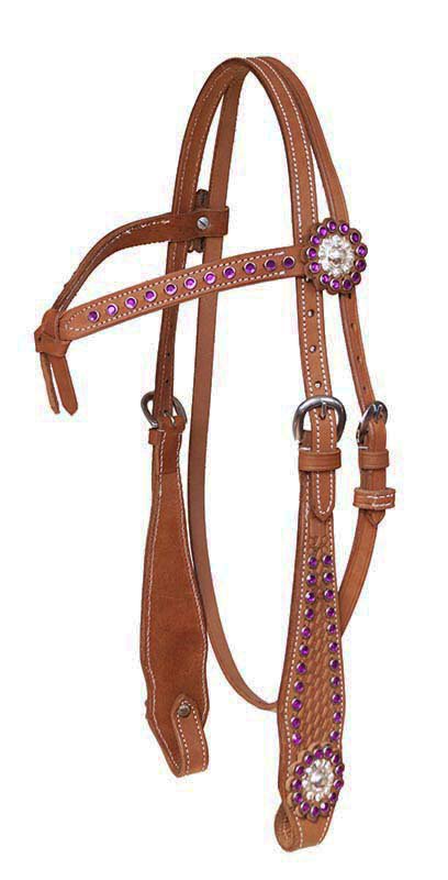 Westernzaum Strasssteine lila weiche Lederqualität doppelt vernäht handpunziert weiße Kontrastnähte gerundete Kanten Edelstahlbeschläge Backenstücke mit Basketpunzierung Knotenstirnband Backenstücke beidseitig verstellbar Gebiss- und Zügelenden mit Chicago Schraubensystem inkl. offene Zügel Farbe: natur hell, natur dunkel Größe: Full